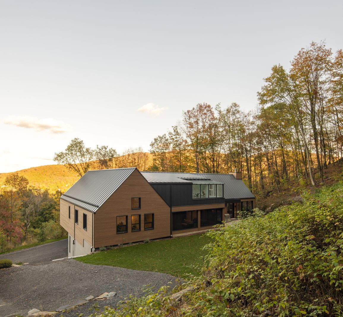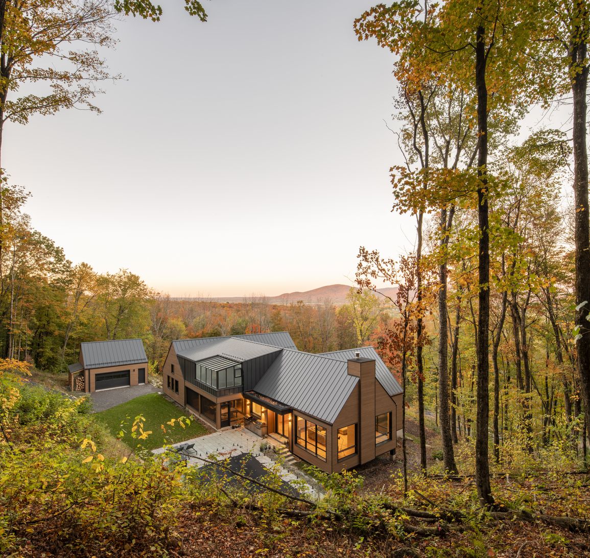 Wood throughout, light on the land, and built around three structures: house, woodshop, and sugar shack.
