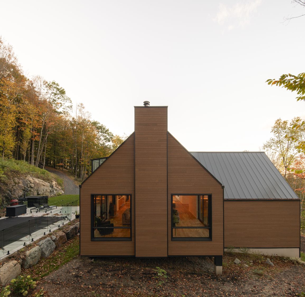 A family home set into the forested slopes of Bromont, lifted above the terrain to meet the treetops and the mountain views beyond.