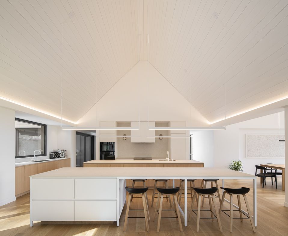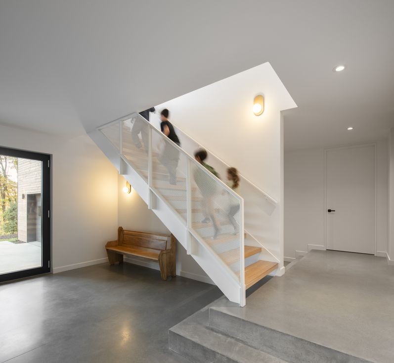 Two bold cantilevers: one at the bedroom wing, one at the living room, give the house its distinctive silhouette. Structurally demanding, the perpendicular bedroom wing can close off entirely, offering a busy family of five a genuine retreat.