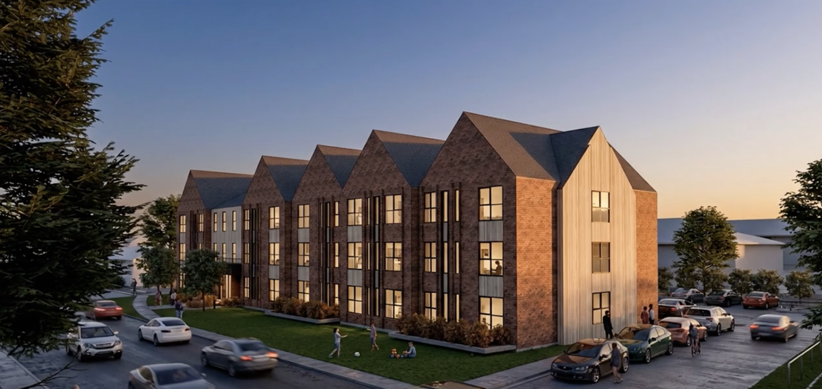 The building mirrors the scale and character of nearby townhomes—pitched roofs, varied façades, and warm materials help it feel right at home in the neighbourhood.